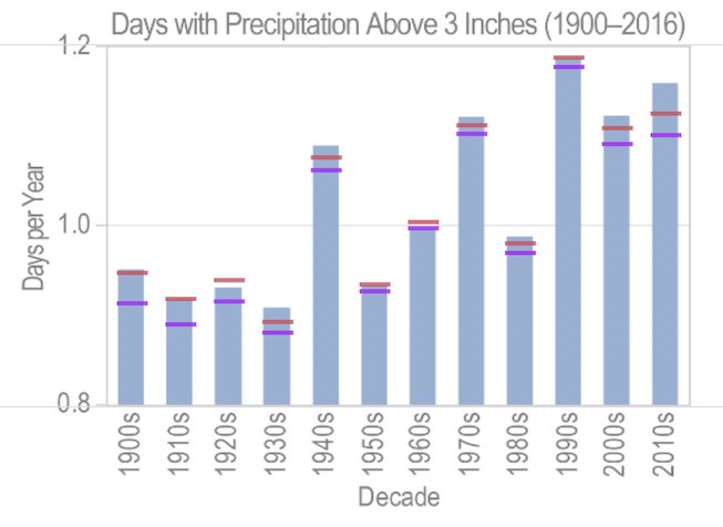 我正在试着理解/复制/修改这张图表东南区美国的国家气候评估.小节的截短比例是经典之作图表的谎言但我也想知道其他特征:不同的阈值(除了3英寸)和不同的聚合(除了几十年)。